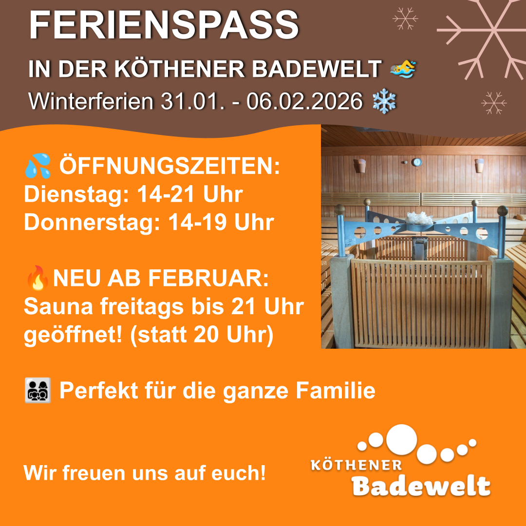 Aktuelles & Veranstaltungenin der Köthener Badewelt AlleAprilFebruarJuniMaiMärzOktober 15.02.2025 – Valentinsaktion: Wenik-RitualFebruar 10.03.2025 – Frauentagsevent „Beauty“März 15.03.2025 – Sauna-Event „Wellness für Körper & Geist“März 26.04.2025 – Sauna-Event nach Hildegard von Bingen „Kräuter und Natur pur“April 24.05.2025 – KSV WettkampfMai Wuselturnier beim CHC_Juni25Juni 25.10.2025 SAUNAEVENT “RAUCHFRISCH”Oktober Köthener Badewelt Ratswall 906366 Köthen 03496 - 508 880 info@koethener-badewelt.de Badelandschaft Saunalandschaft Angebote & Kurse Aktuelles & Veranstaltungen Haus- & Badeordnung Impressum Datenschutz Erklärung zur Barrierefreiheit Kontakt & Öffnungszeiten Preise Gastronomie FAQs Gutscheine WelterbeCard Stellenangebote Wertkartensystem