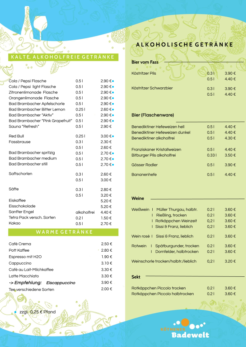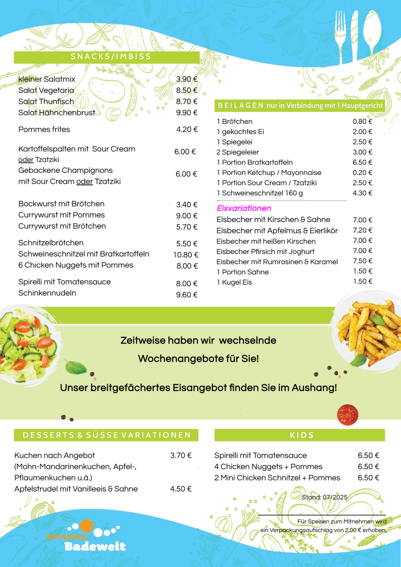 Für den kleinen und großen Hunger ist gesorgt. Das Team versorgt Sie mit verschiedenen Speisen und Getränken im Bistrobereich der Köthener Badewelt.